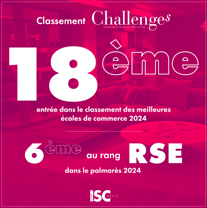 Challenges propose quatre classements précis aux étudiants en quête d’informations sur les formations. Cette année l’ISC Paris se place à la 18ème place des meilleures écoles de commerce. Les critères pris en compte sont : le budget annuel de l’école, les accréditations, l’attractivité du programme, le taux de mentions bien et très bien parmi les néo bacheliers intégrés, l’encadrement des élèves et les salaires d’embauche à la sortie. L’école affiche fièrement sa 6ème place au rang RSE.